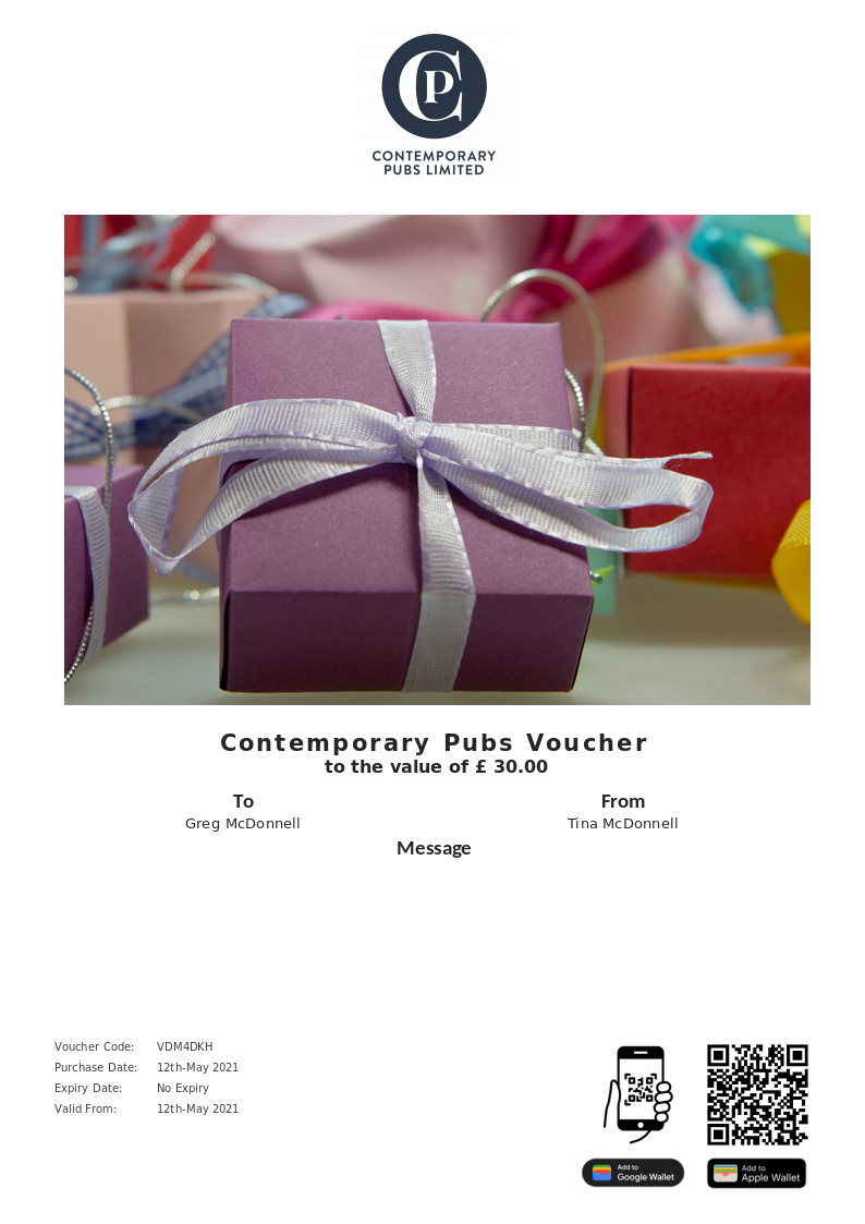 Contemporary Pubs allows you to purchase instantly printable gift vouchers, special offers and tickets using the Voucher Connect platform.